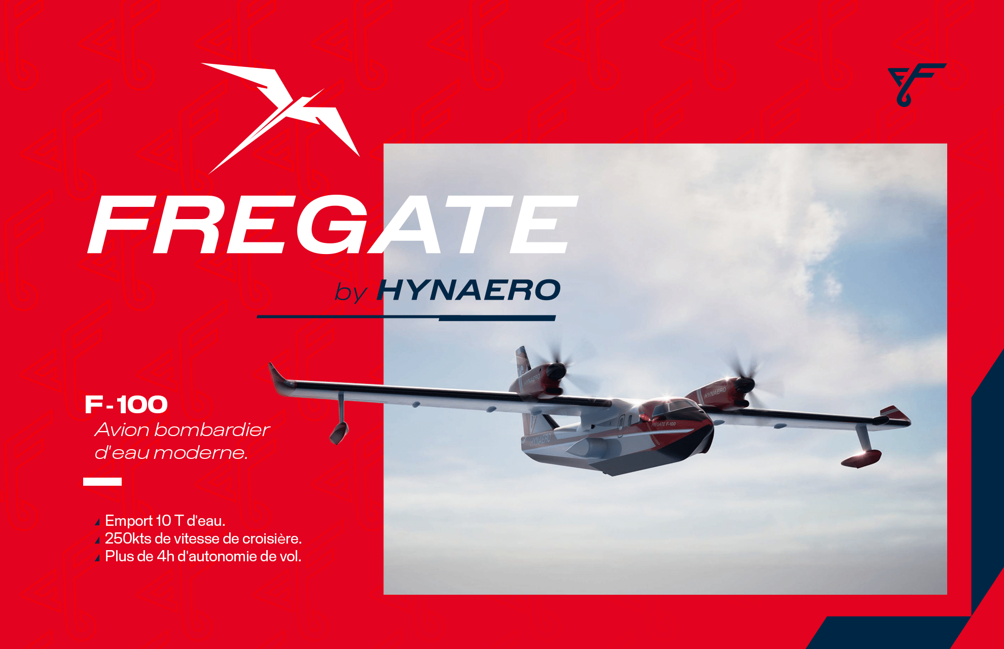 Réalisation du logo pour la société Bordelaise Hynaéro qui porte le programme européen FREGATE-F100, avion de nouvelle génération pour lutter contre les feux de forêt. Nous retrouvons donc sur ce logo des ailes qui portent un goutte d’eau. Ces ailes symbolisent la protection, le sauvetage par les airs (ange). Le style moderne du logo avec sa typographie symbolisent la technologie novatrice apporté par cet avion. Le symbole représente également le sigle FF pour «Fire Fighters». Enfin on retrouve les couleur bleu et rouge pour l’eau et le feu. Le logo «Frégate» ,qui est le nom de l’avion, a également été conçu en complément.