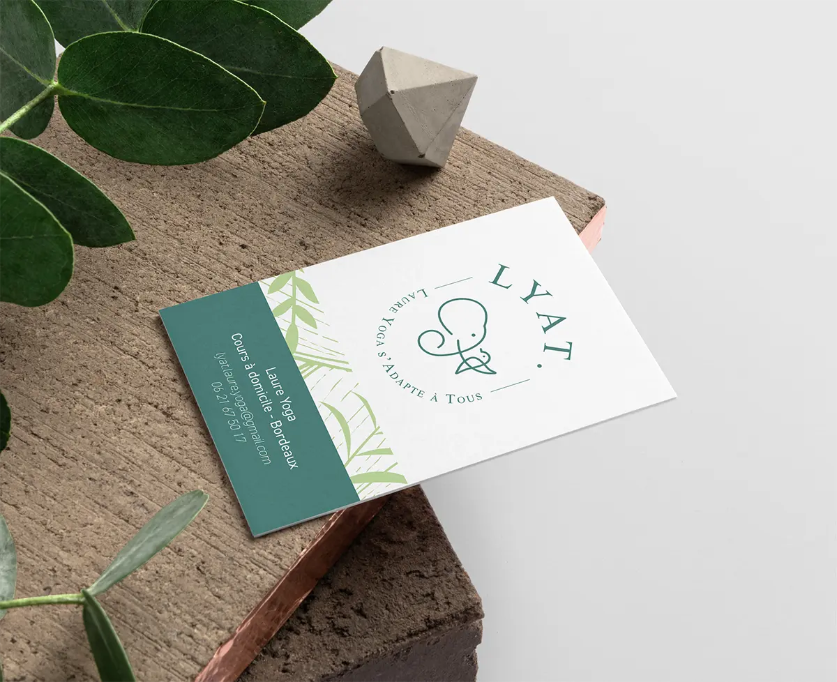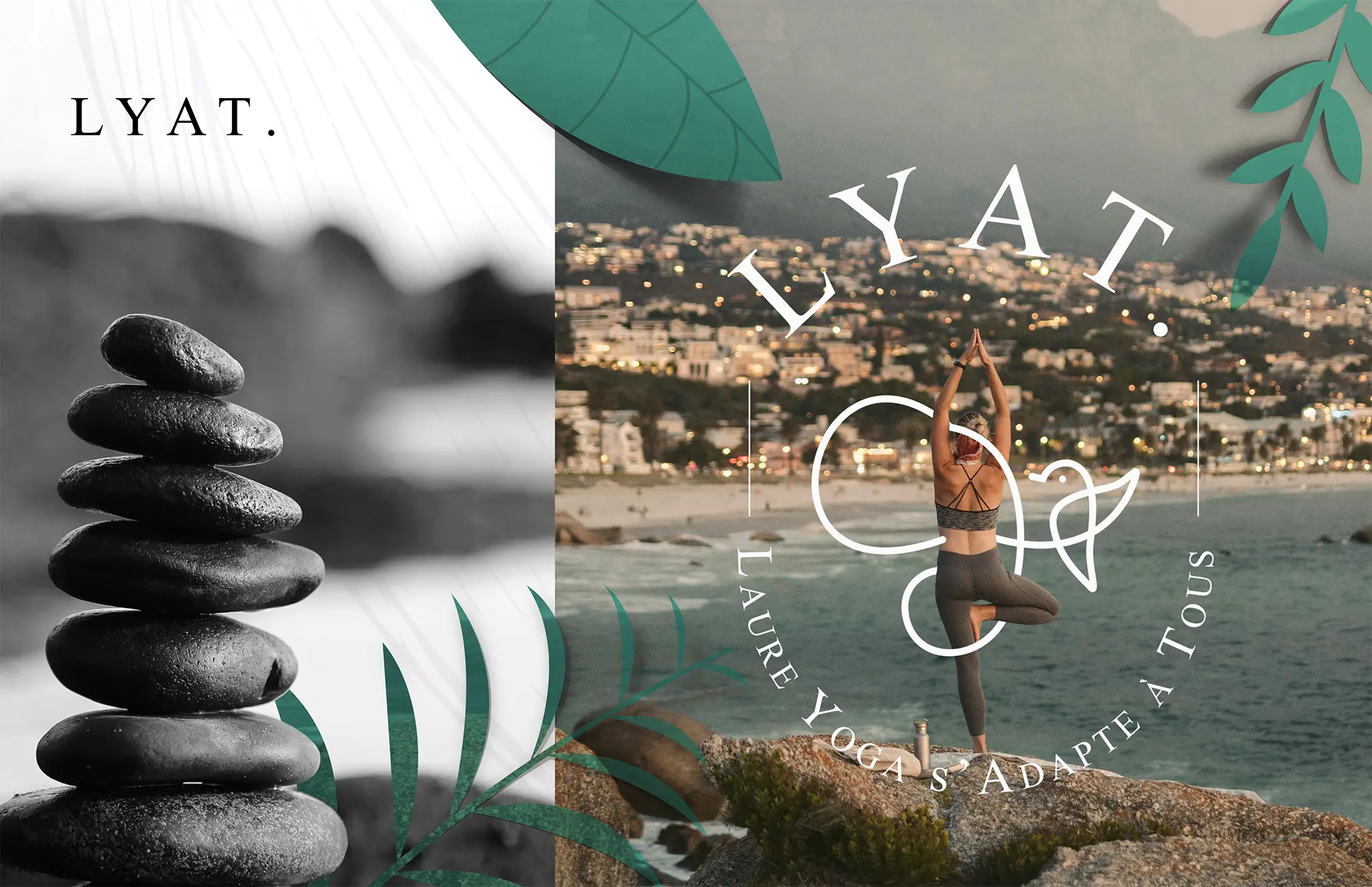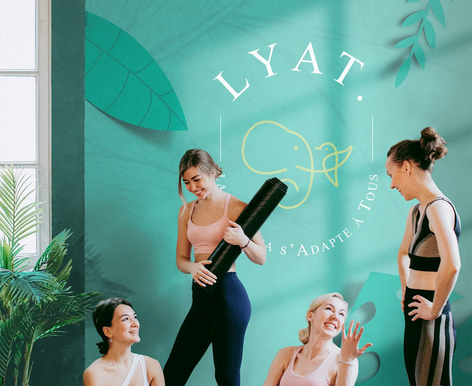 Réalisation du logo LYAT, sigle pour ”Laure Yoga s’adapte à tous“. Laure propose des cours de Yoga à domicile adaptés à tous niveaux et tous âges. L’objectif est très simple, le bien-être pour tous avec bienveillance et professionnalisme. Le logo représente un éléphant et un colibri liés l’un à l’autre symbolisant la force, la bienveillance et la solidarité. Les teintes de vert mettent en avant le côté naturel et viennent appuyer le sentiment de paix et de calme qui caractérisent l’activité.
