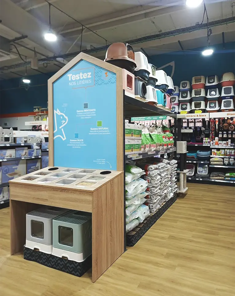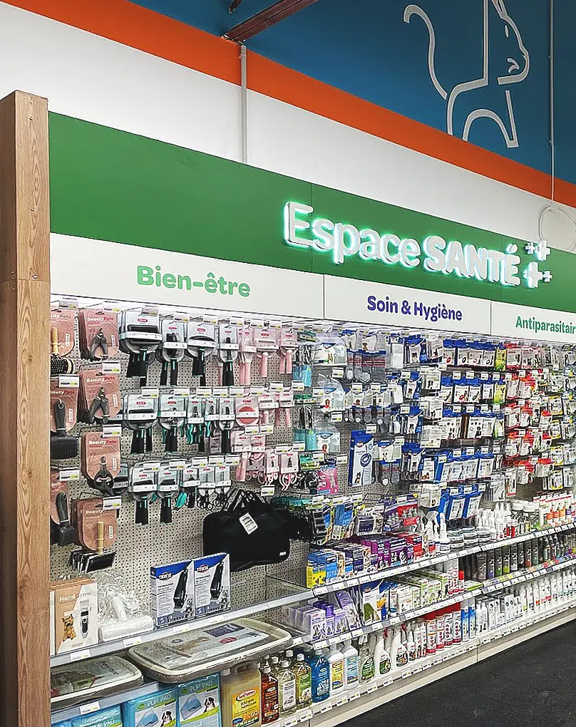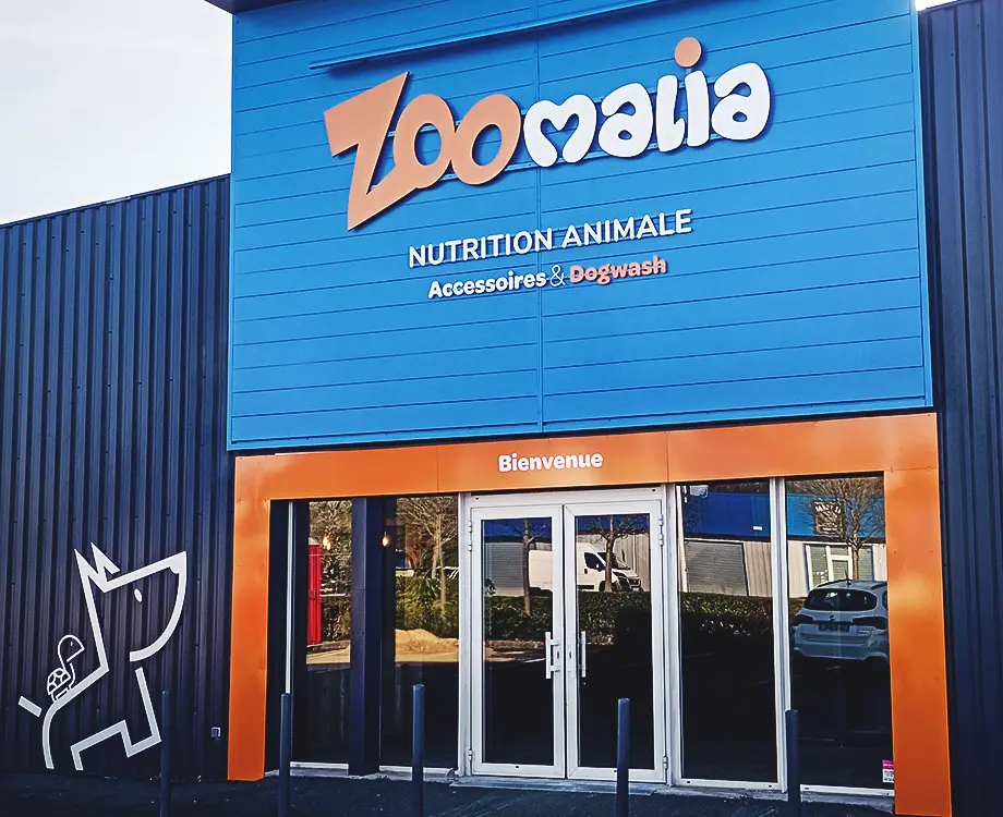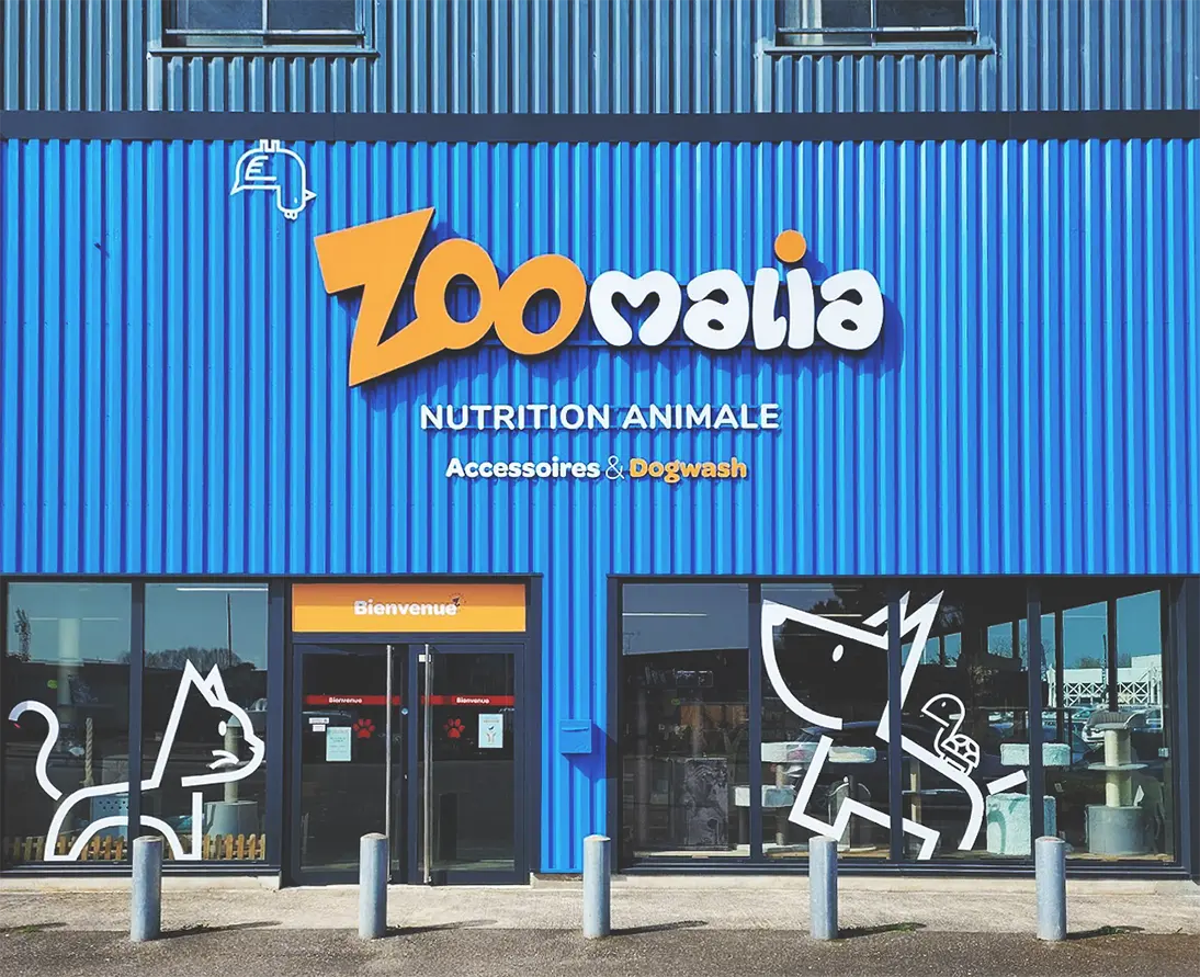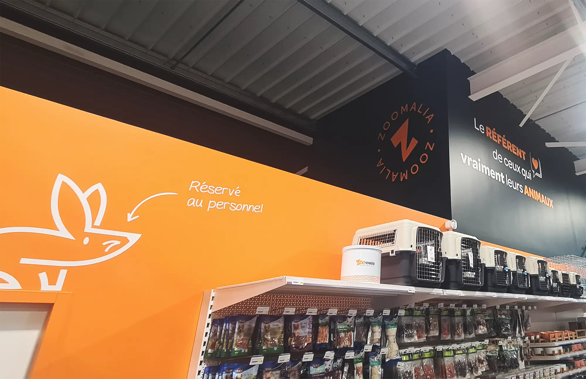 Dans le cadre de mon acivité salariée à Zoomalia j’ai effectué un travail complet au niveau des magasins sur l’habillage graphique que ce soit sur les parties extérieures ou intérieures. Les façades ont été réalisées avec les couleurs, l’enseigne ainsi que des éléments graphiques. Pour la partie intérieure, le travail à été réalisé sur l’habillage mural avec le choix de l’emplacements des peintures, éléments graphiques et visuels en grand formats. Du mobilier à également été réalisé pour la mise en avant des marques propres ainsi que des espaces santé et hygiène. Enfin la signalétique des rayonnages à été créée et déployée pour facilité l’expérience clients.