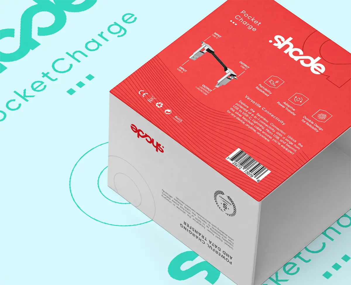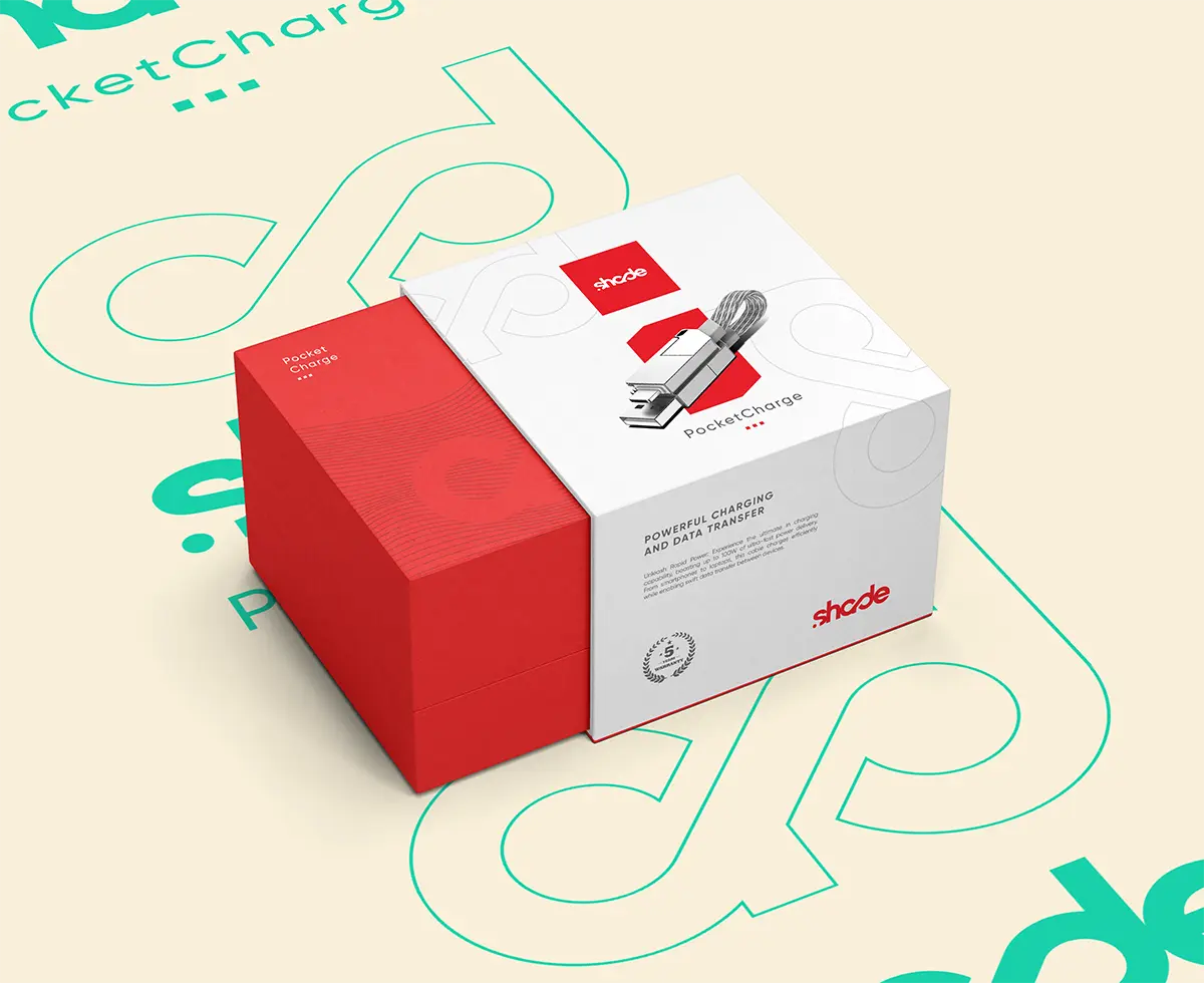 Réalisation du packaging d’un chargeur USB haute performance pour une marque implantée en Chine. La société souhaitait moderniser ses packagings à commencer par le chargeur USB “Pocket Charge”, son produit phare. Le design du packaging privilégie la mise en avant du produit à l’aide d’un design moderne et épuré. On y retrouve les symboles du logo ainsi que de fines courbes matérialisant l’énergie. Les couleurs utilisées sont restées celles du logo pour un soucis d’uniformité et de visibilité.